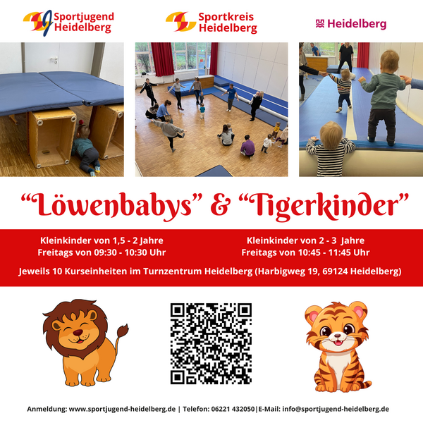 Ab dem 16.01.26 starten wieder neue Kursreihen der "Löwenbabys" und "Tigerkinder". Für die Kleinsten im Alter von 1,5 bis 3 Jahre haben wir einen speziellen Kurs „Löwenbabys“ und "Tigerkinder" im Turnzentrum Heidelberg, eingerichtet. In diesen Kursen liegen die Schwerpunkte auf einer behutsamen Förderung, die für den individuellen Entwicklungsstand der Kinder bestmöglich geeignet ist.