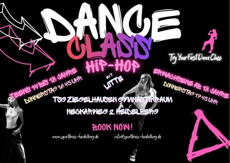 Ab dem 16.04.2026 bietet der Sportkreis Heidelberg und die TSG Ziegelhausen HipHop Kurse für Jugendliche und Erwachsene an. Bist du bereit, deinen Körper zu pulsierender Musik zu bewegen? Unsere HipHop Dance Class mit Lotte für Anfänger bringt dich auf das nächste Level. Lerne coole Moves, verbessere deinen Style und hab jede Menge Spaß in einer dynamischen, motivierenden Atmosphäre.