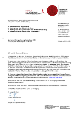 Es soll den in den bisherigen Workshops begonnenen Austausch mit Ihnen zur Entwicklung des Sports in Heidelberg fortgesetzt und außerdem alle Interessierten aus der Heidelberger Bevölkerung einbezogen werden. Hierzu lädt Sie das ISSW zu einem Workshop am Freitag, 21. November 2025, von 17:00 bis 21:30 Uhr, in das Institut für Sport und Sportwissenschaft, Im Neuenheimer Feld 700, 69120 Heidelberg, ein. Mit allen Anwesenden sollen sowohl die Ergebnisse unserer Datenerhebungen zum Sport- und Bewegungsverhalten der Heidelberger Bevölkerung als auch die in den bisherigen Projektworkshops bearbeiteten Themen diskutiert werden. Den voraussichtlichen Ablaufplan finden Sie anbei.